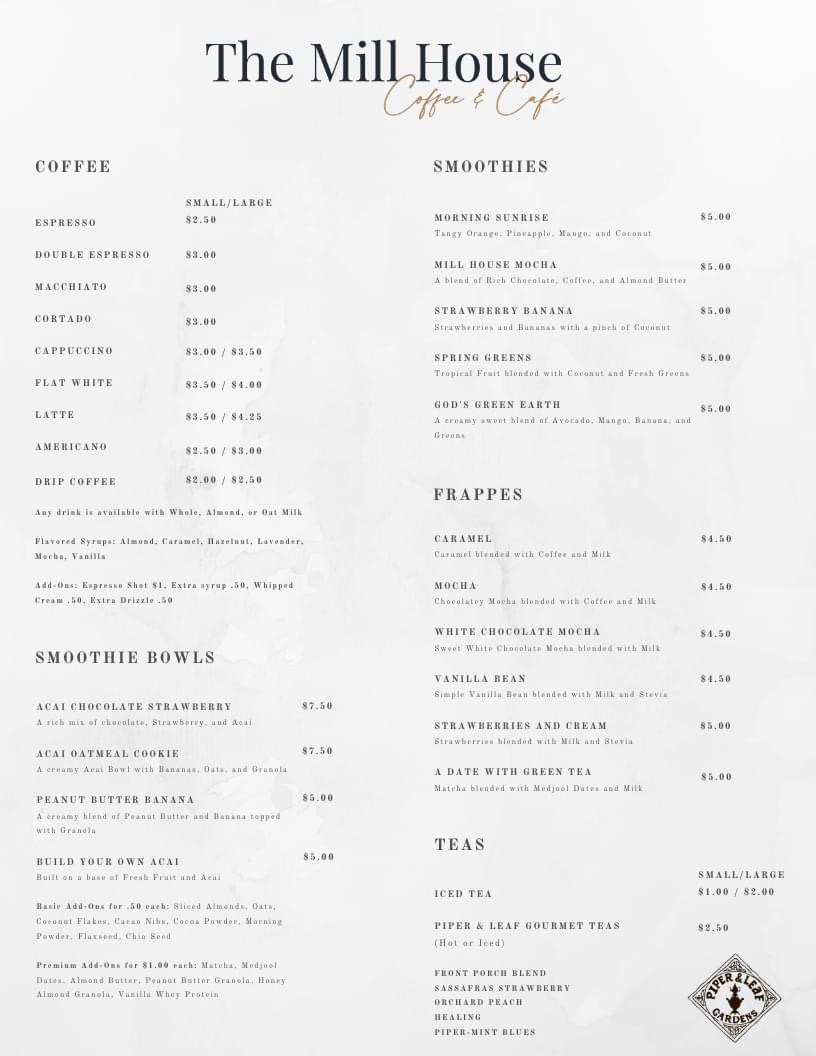 Welcome to Mill House Coffee & Cafe, a charming escape in Hamilton, Alabama, located at 228 1st St SW. This delightful cafe combines a warm atmosphere with a menu that's crafted for quality and taste. Start your day with their invigorating smoothies like Morning Sunrise or savor the indulgence of their Caramel Frappe, which has garnered rave reviews for its rich flavor.